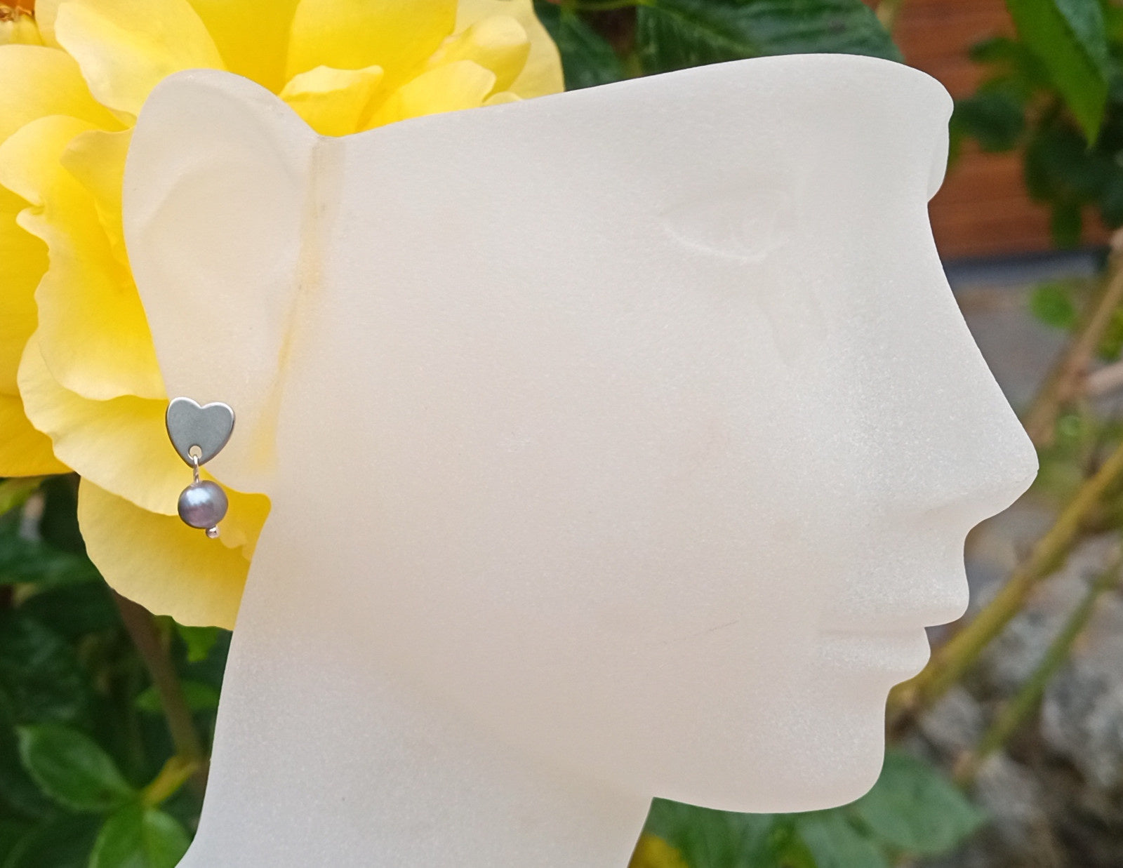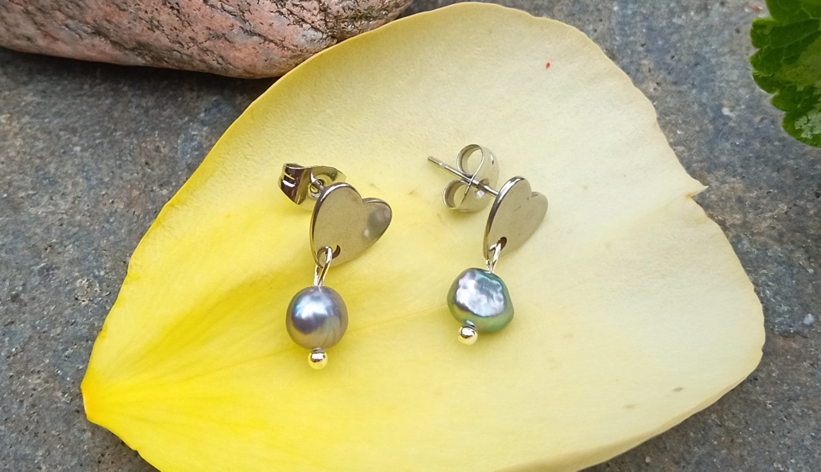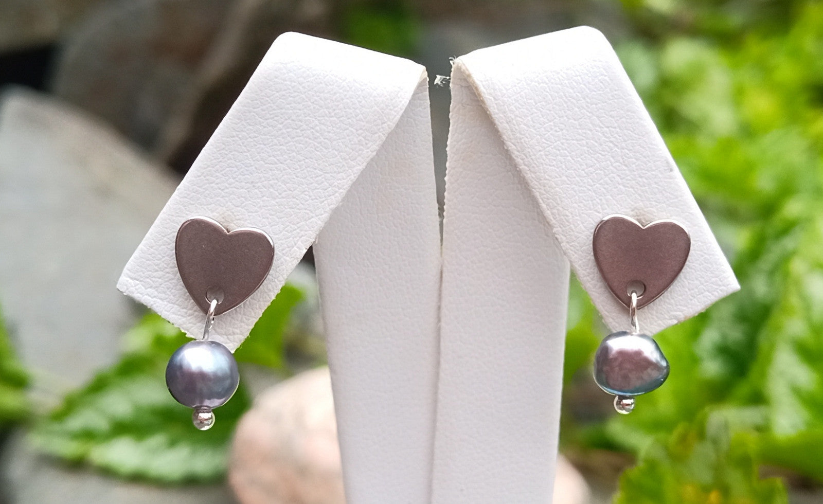 Náušnice s říčními perlami pod srdíčkem z chirurgické oceli