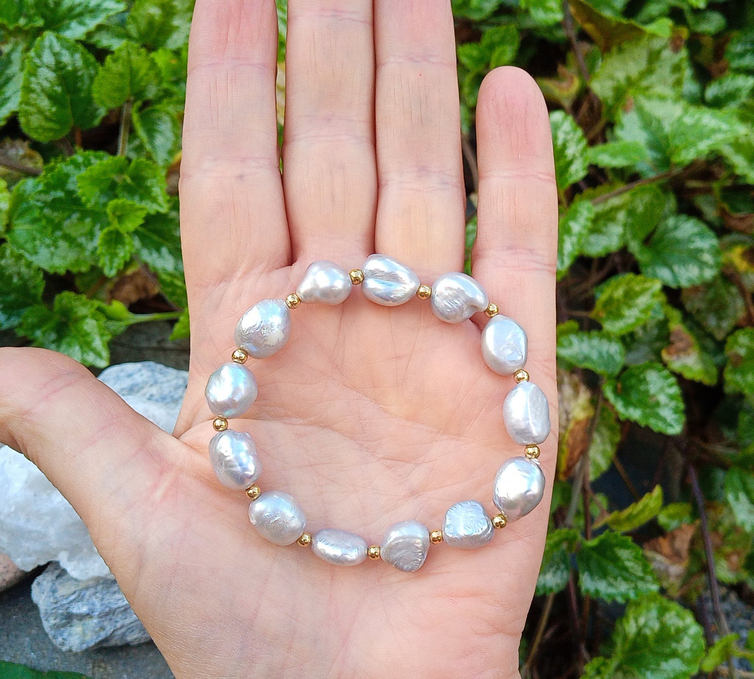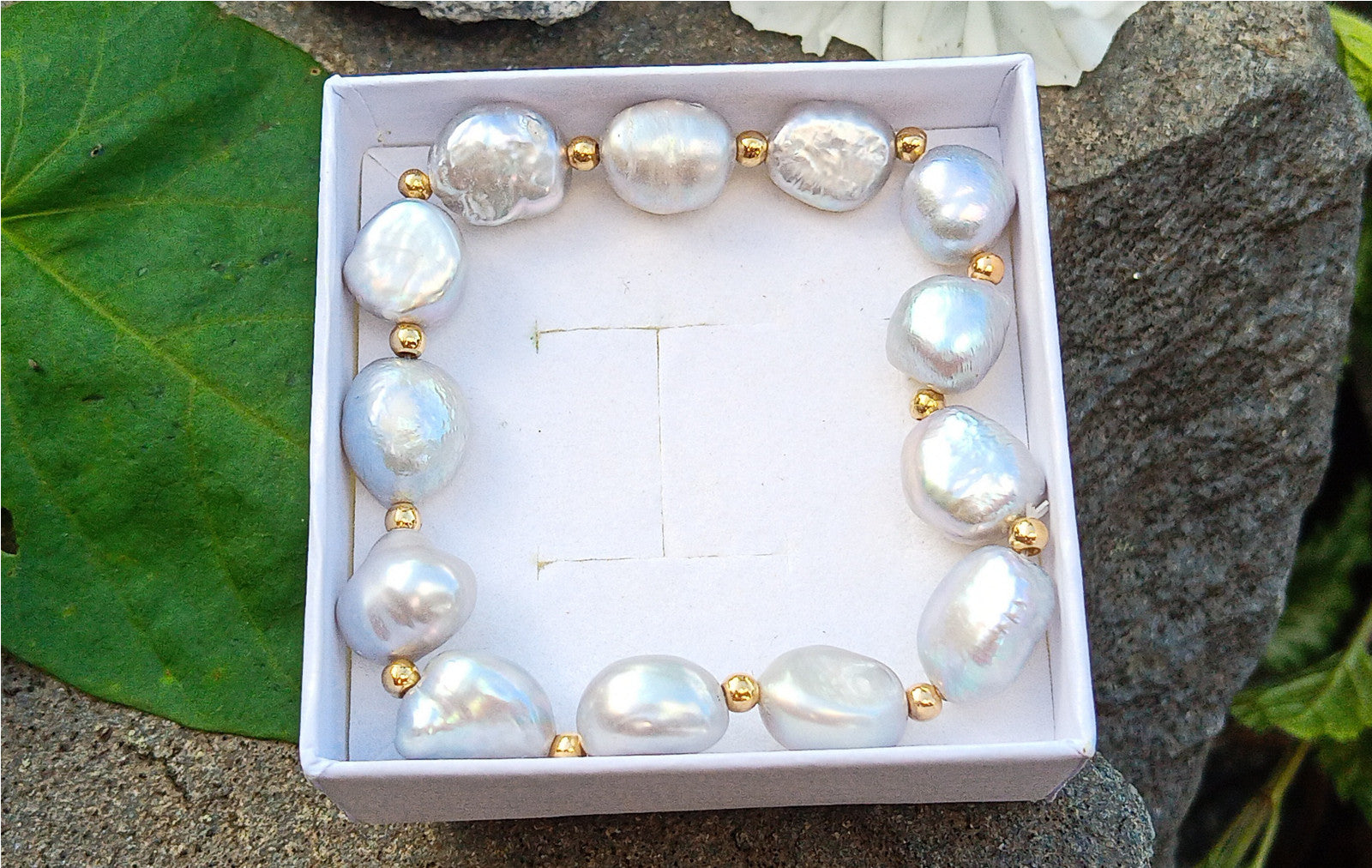 Tento pružný náramek z obřích šedých říčních perel okouzlí jemným leskem a decentní barevností, která se pohybuje od stříbrných až po lehce grafitové tóny. Každá perla je originál vytvořený přírodou – žádné dvě nejsou zcela stejné.