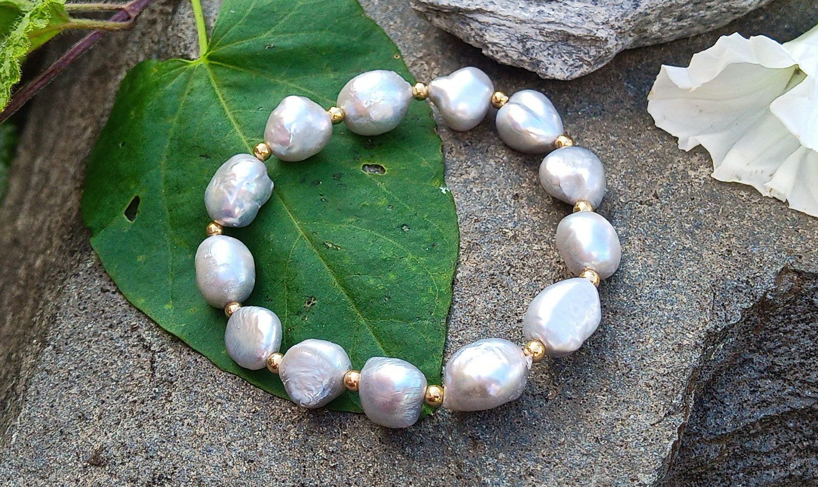 Velké šedé říční perly jsou pečlivě vybrané a navléknuté na kvalitním pružném vlákně.